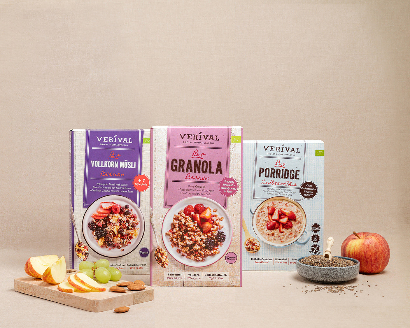 At Verival, every muesli, granola, crunchy and porridge is carefully produced in Tyrol. We only use high-quality organic ingredients in our organic factory in Langkampfen. When it comes to partners and suppliers, we pay attention to regionality wherever possible and focus exclusively on organic quality, sustainability and fair working conditions.