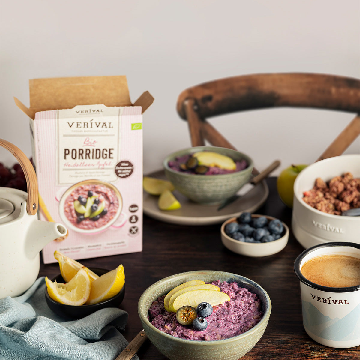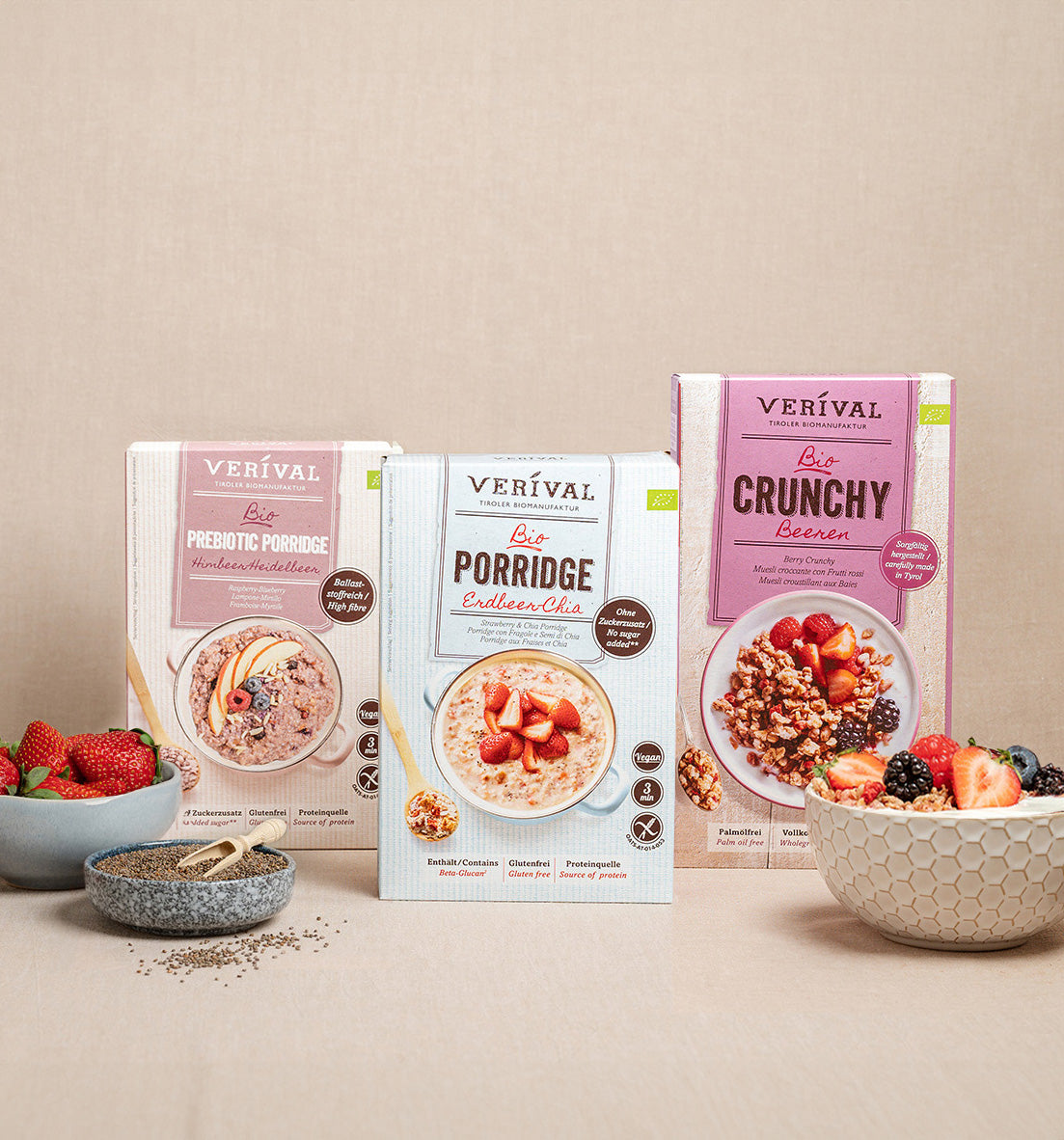 A healthy breakfast is the perfect start to your day! As a manufacturer of organic breakfast products, we at Verival have made it our goal to help you start every day with the right breakfast. We have a wide selection for you, because we don't want you to get bored at the breakfast table, which is why we supply our porridge, muesli and granola in numerous flavours. For the creative among you: Have you already browsed through the many flakes, cereals and toppings (chia seeds, berries, etc.) for a completely personalised breakfast experience? All our breakfast products are carefully produced in Tyrol - 100% organic quality and natural enjoyment. Discover your favourite breakfast products now.