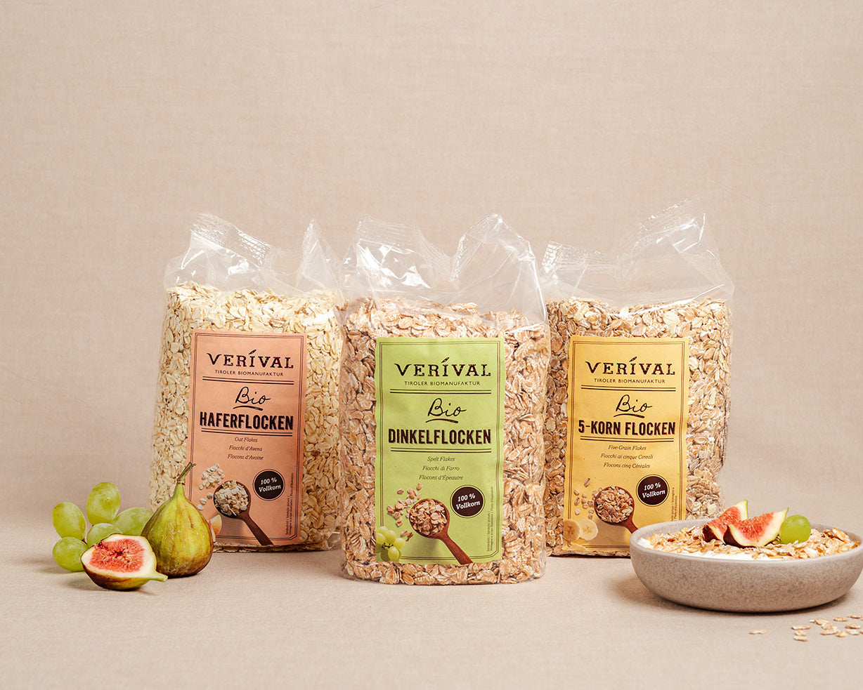 The cereal flakes are suitable for children, teenagers, adults, athletes and the elderly. Thanks to their valuable nutrients, they contribute to a healthy and nutritious diet at all stages of life. In our range you will find numerous porridge mixes, which are lovingly prepared by hand using the best organic ingredients. We always pay attention to the quality of the raw materials and focus on regionality and sustainability. The basis for the VERIVAL porridge products, oat bran, is grown and processed in Tyrol, so that you too can benefit from the breakfast flakes and buy the organic flakes from us, then simply click on the online shop and you can have the flakes delivered to your home.