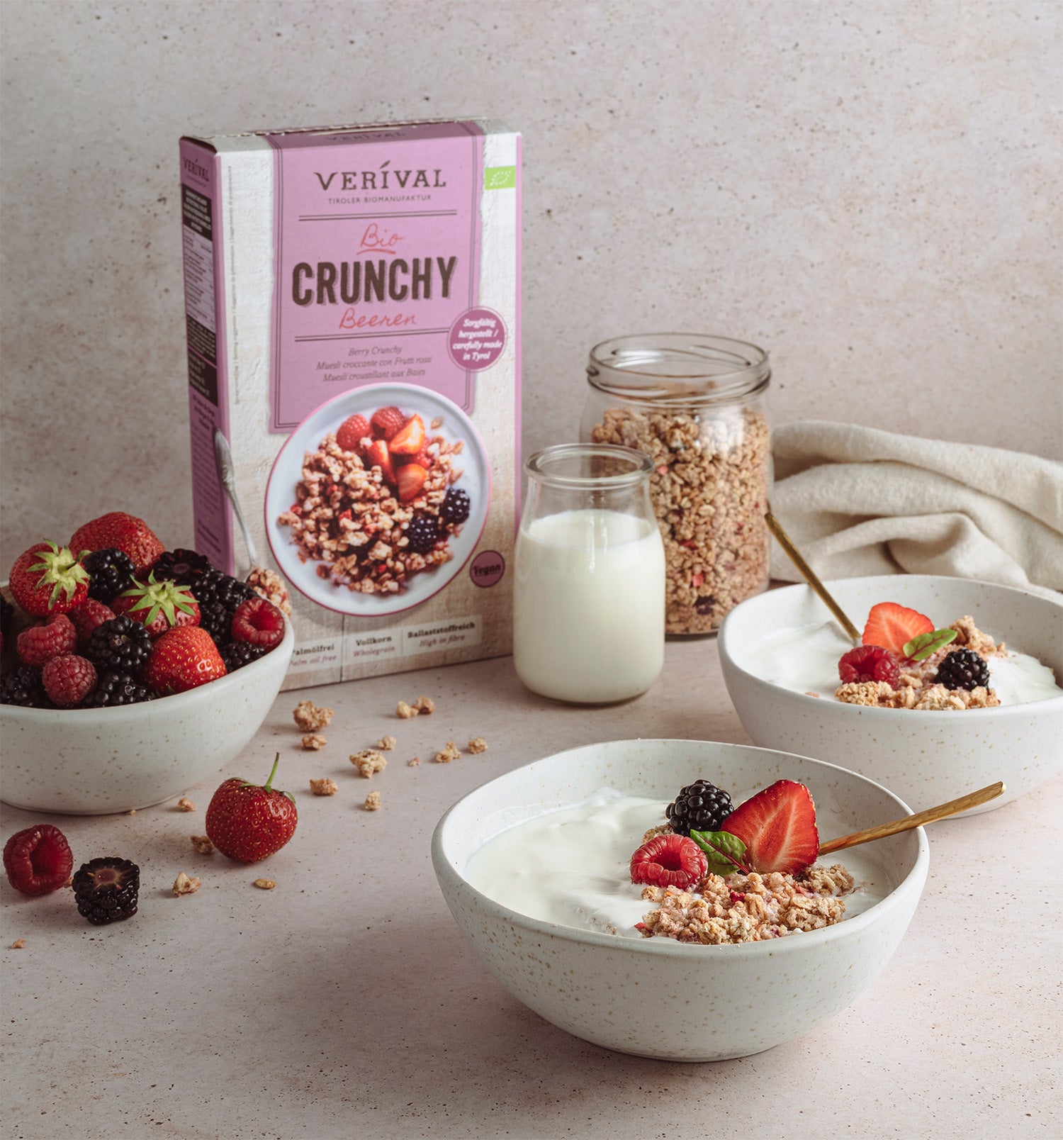 Discover delicious varieties of crunchy, crunchy muesli and granola at Verival. Our crunchy crunchies contain only the best organic ingredients such as spelt, selected nuts and coconut, baked in environmentally friendly sunflower oil. Each granola muesli is handmade in Tyrol, and we sweeten sparingly with honey to preserve the natural flavour. Available directly from Verival online.