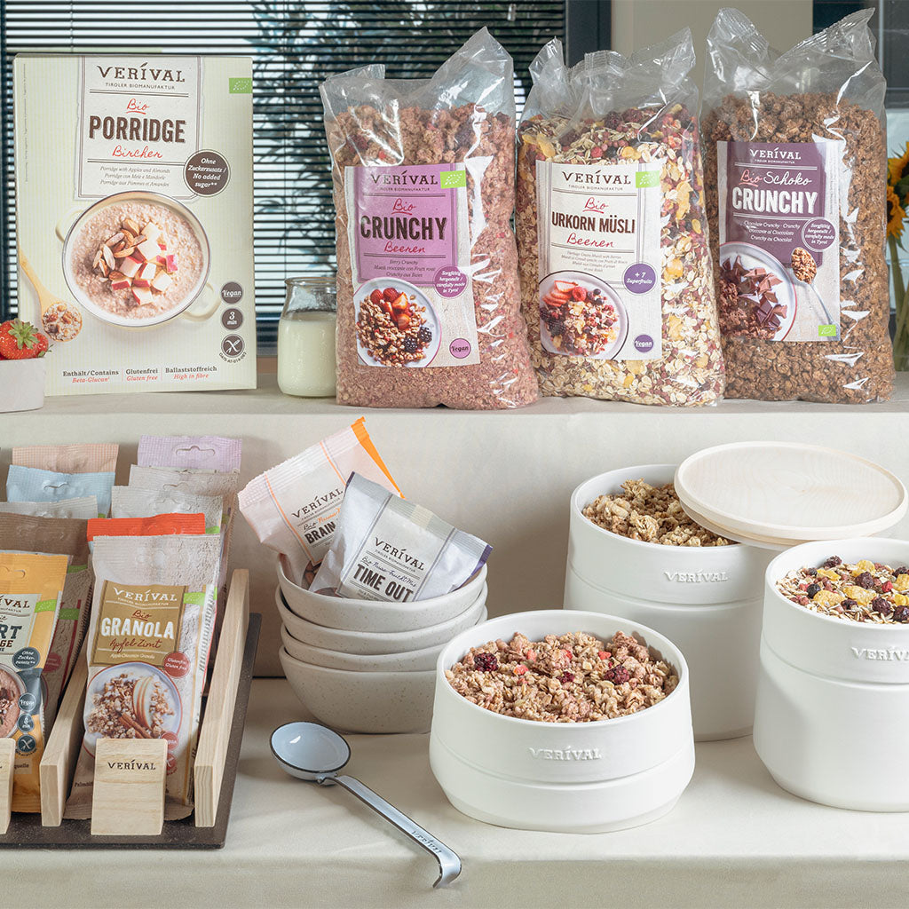 Are you looking for breakfast options for your office, office kitchen, canteen or events? At VERIVAL, we offer high-quality premium organic breakfast products from Tyrol for a well-rounded and comprehensive breakfast buffet.